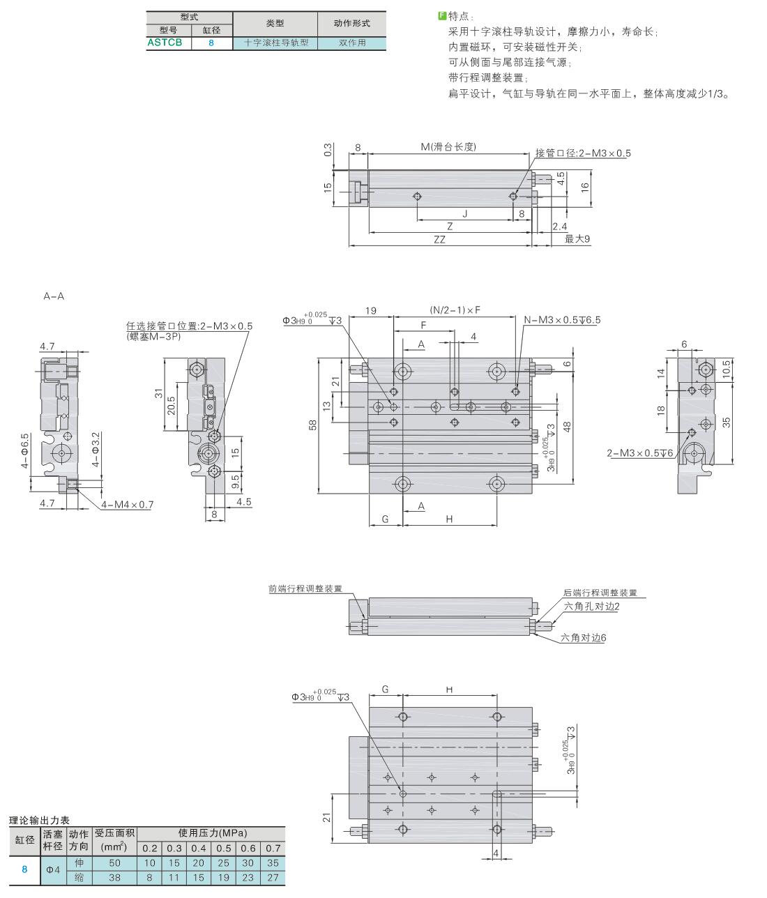 气动滑台 十字滚柱导轨型 超薄型 缸径8