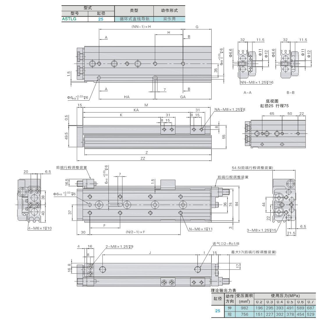 气动滑台 循环式直线导轨型 标准型 缸径25