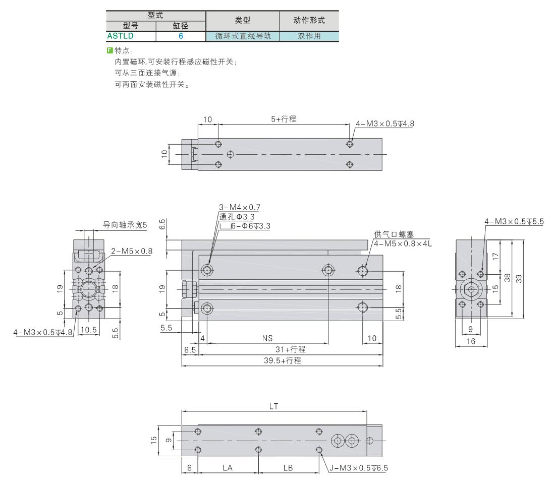 气动滑台 循环式直线导轨型 侧轨型 缸径6