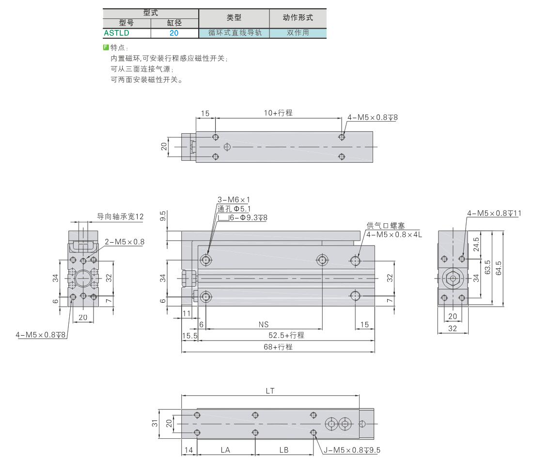 气动滑台 循环式直线导轨型 侧轨型 缸径20