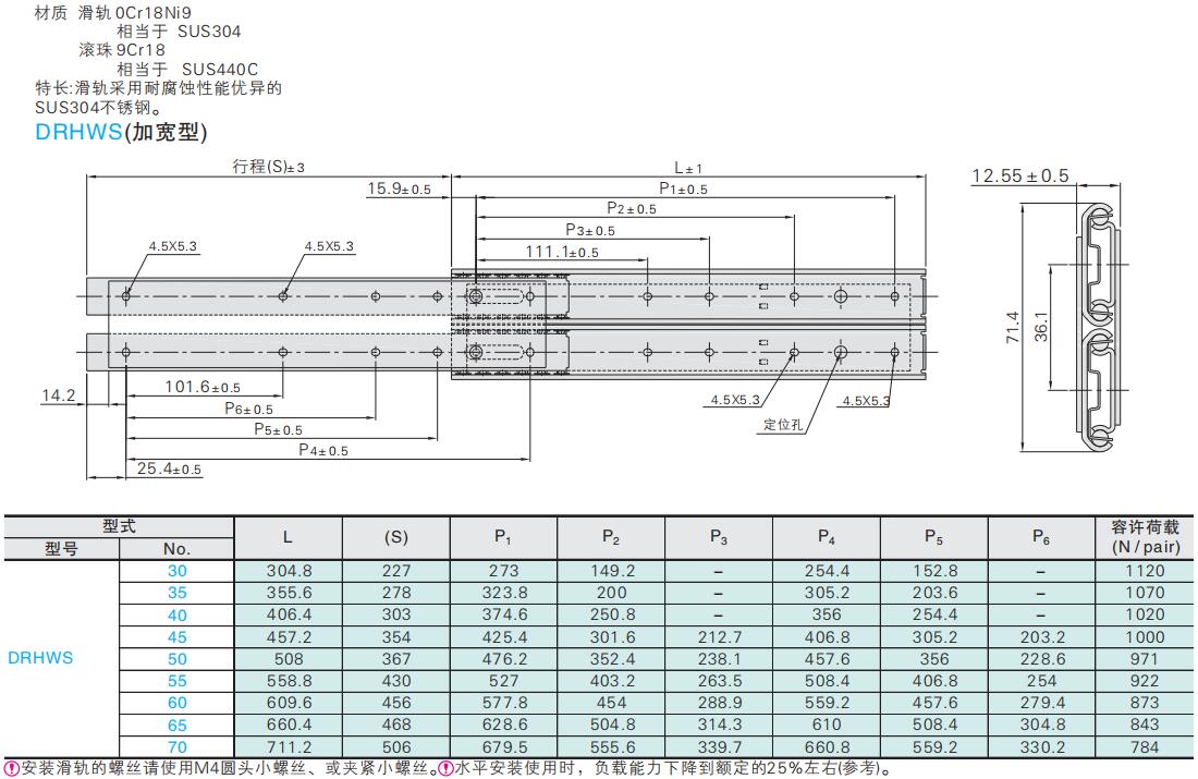 抽屉滑轨 重载型 不锈钢制 两段型 加宽型