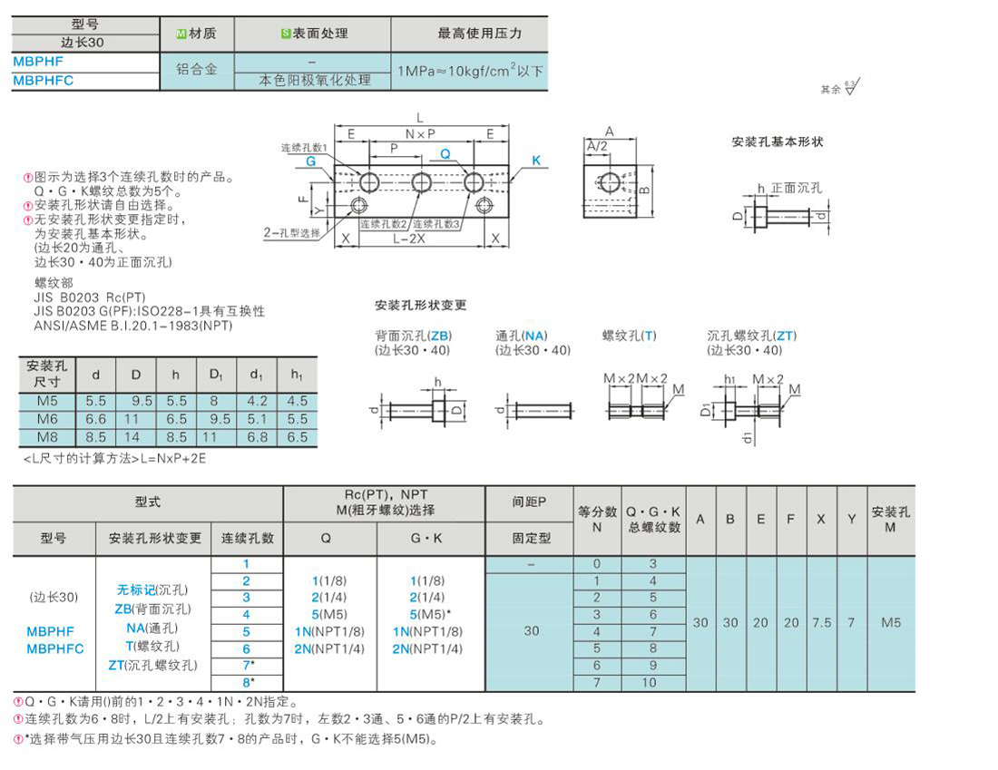 歧管块 横向通孔 顶孔型 螺纹直径选择型 气压用 30方型