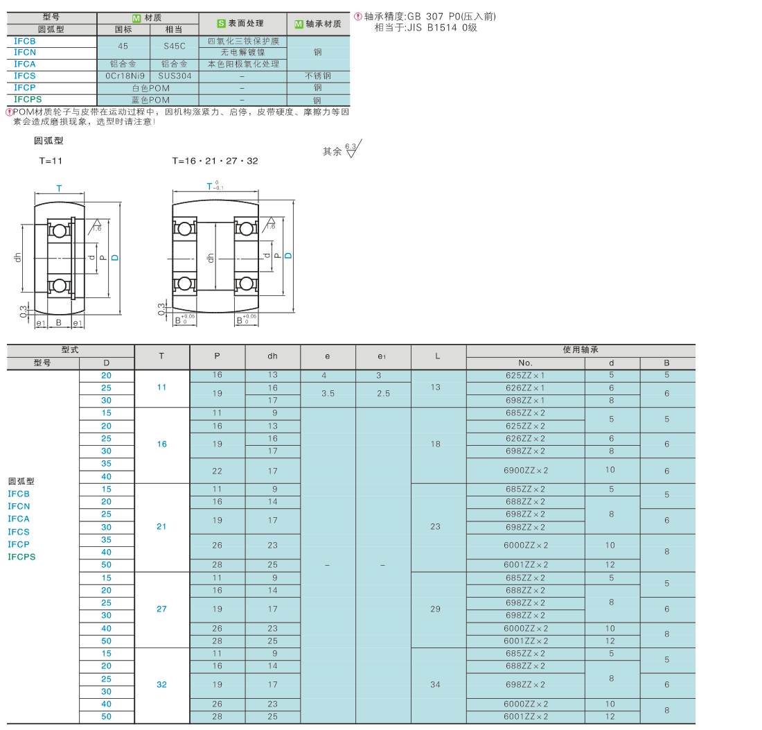 平皮带用惰轮 宽度 T=6~32 圆弧型